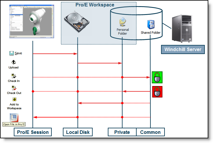 As a user familiar with Pro/INTRALINK 3.x, it is common to be confused by some of the "new" terminology, or by existing terms that now seem to mean something different. I hope to clarify this by explaining how data travels between a Pro/ENGINEER session and a shared area on the server (Commonspace). This is based upon the excellent verbal descriptions and material from our Product Manager, Graham Birch.
