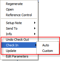 | Check in | Save & Upload + Check In are the equivalent of iterating modified objects. From within Pro/E, the single operation Check In > Auto is also available. |